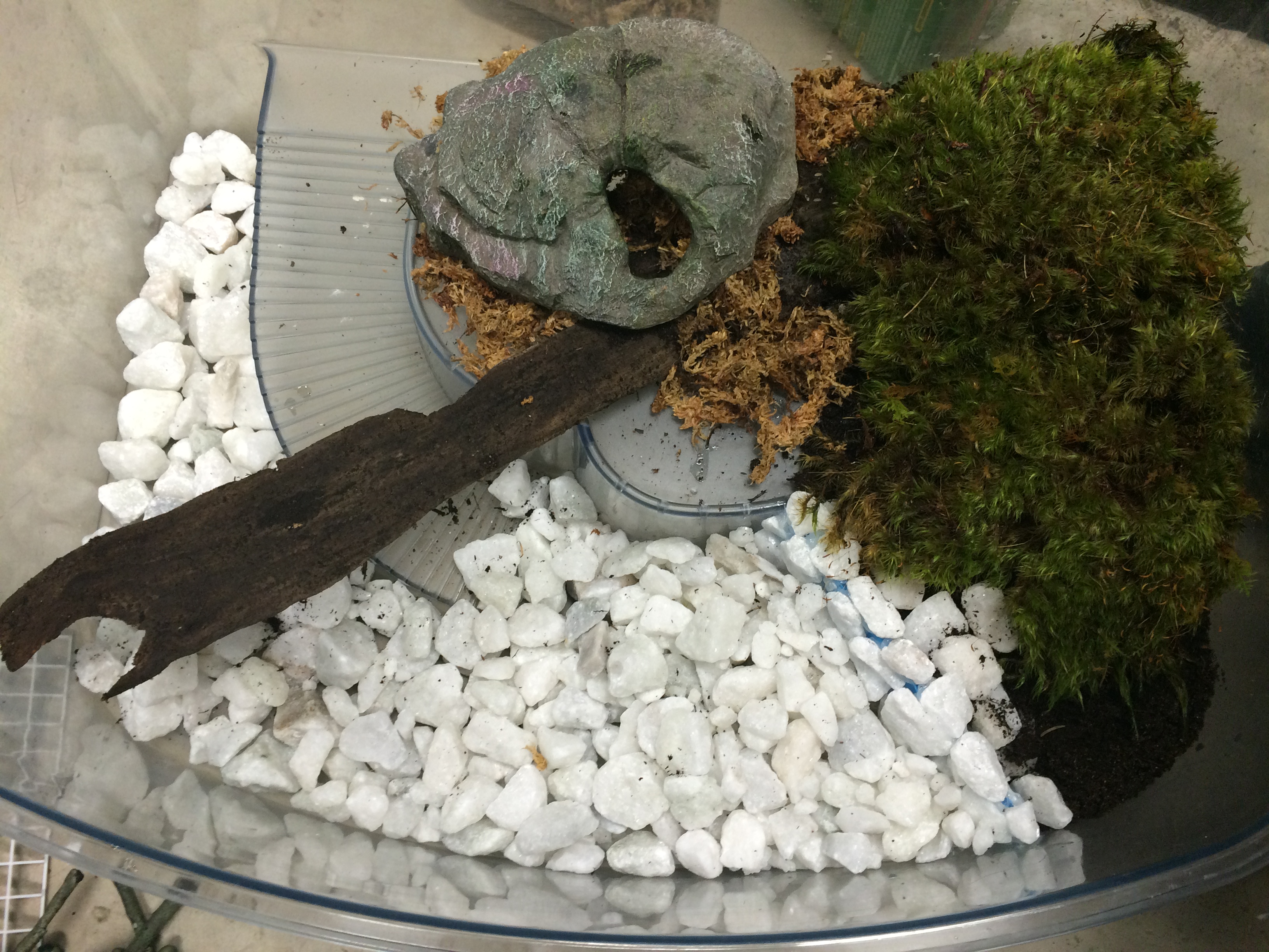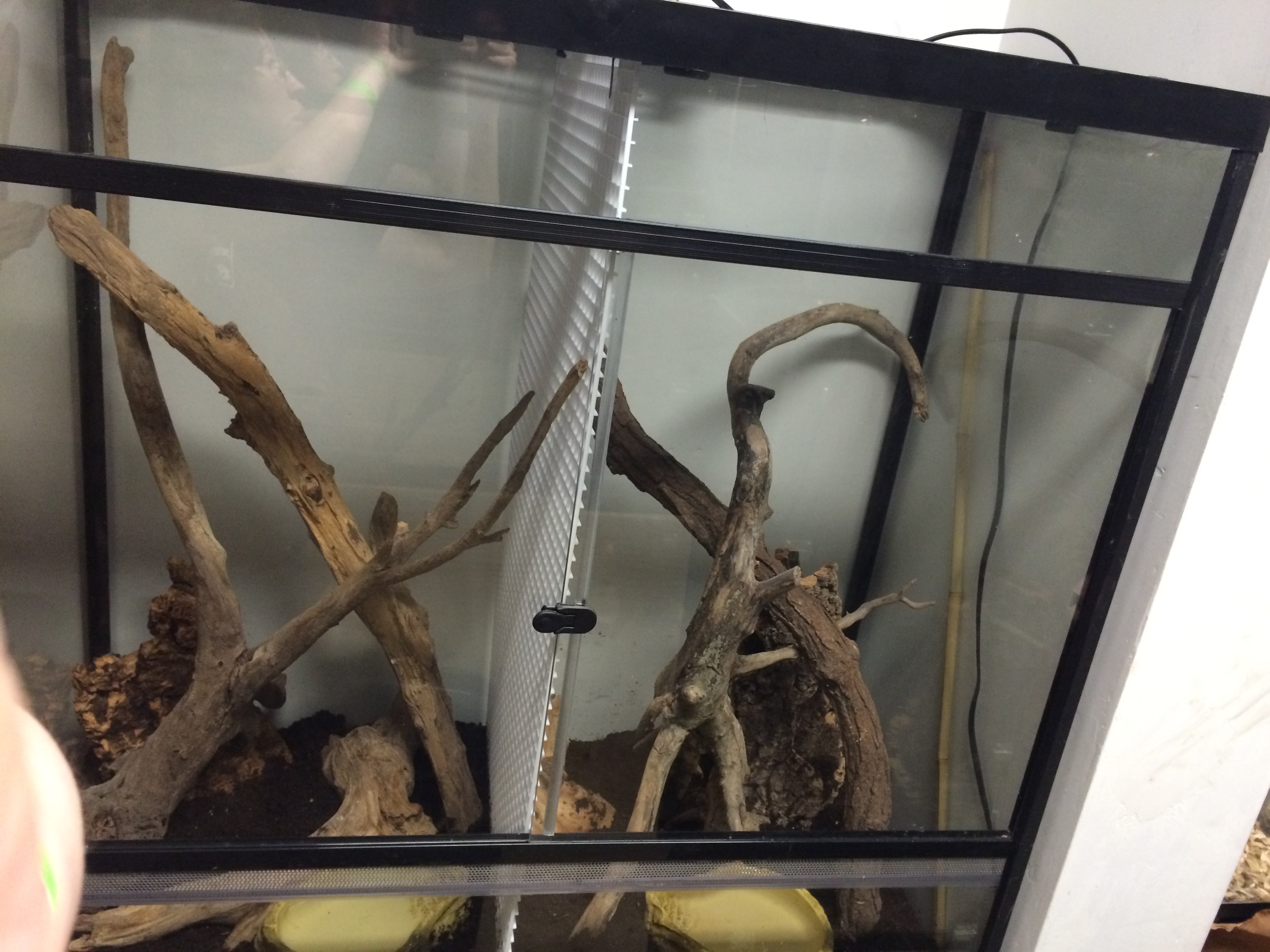 Split tank with deep substrate and climbing branches (hammocks added after):