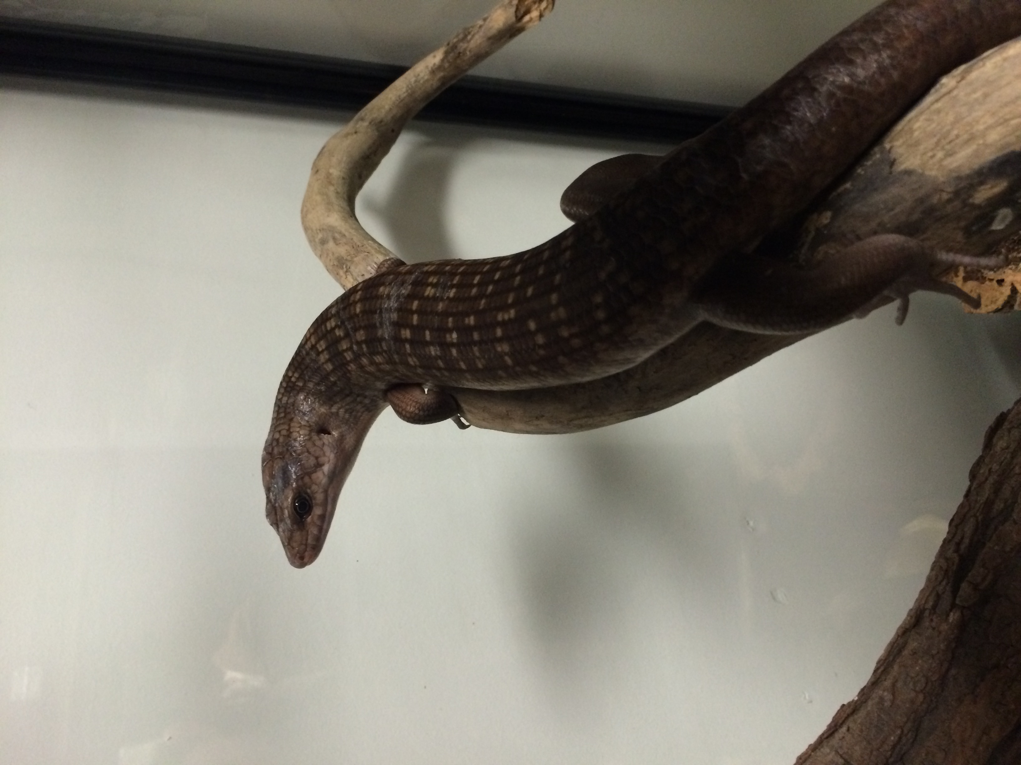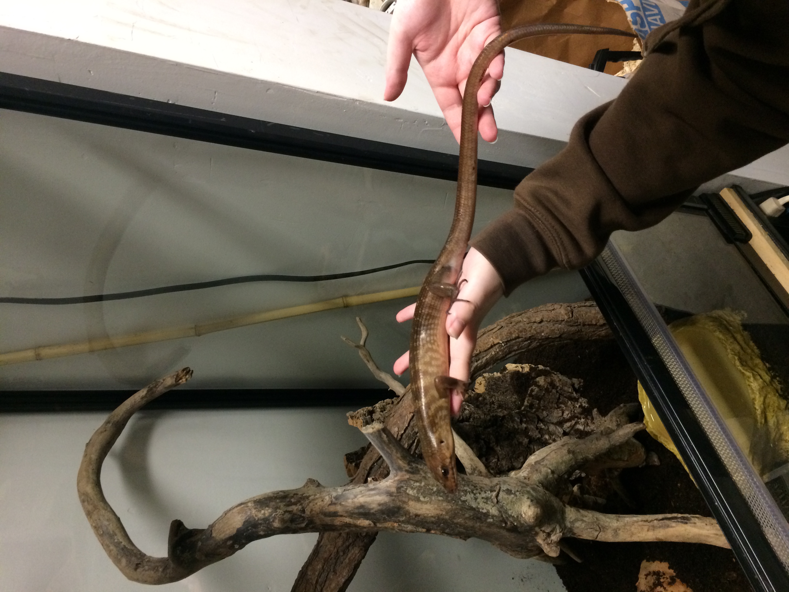 Their scientific name (if I’ve guessed the subspecies correctly) is Eugongylus albofasciolatus. They originate from around the Solomon Islands, and are quite long but very slender. They seem to have no natural fear of humans and have shown a voracious appetite for insects so far. They like to dig tunnels and burrow through the dirt, but I’ve also caught them climbing the branches of the tank a few times.