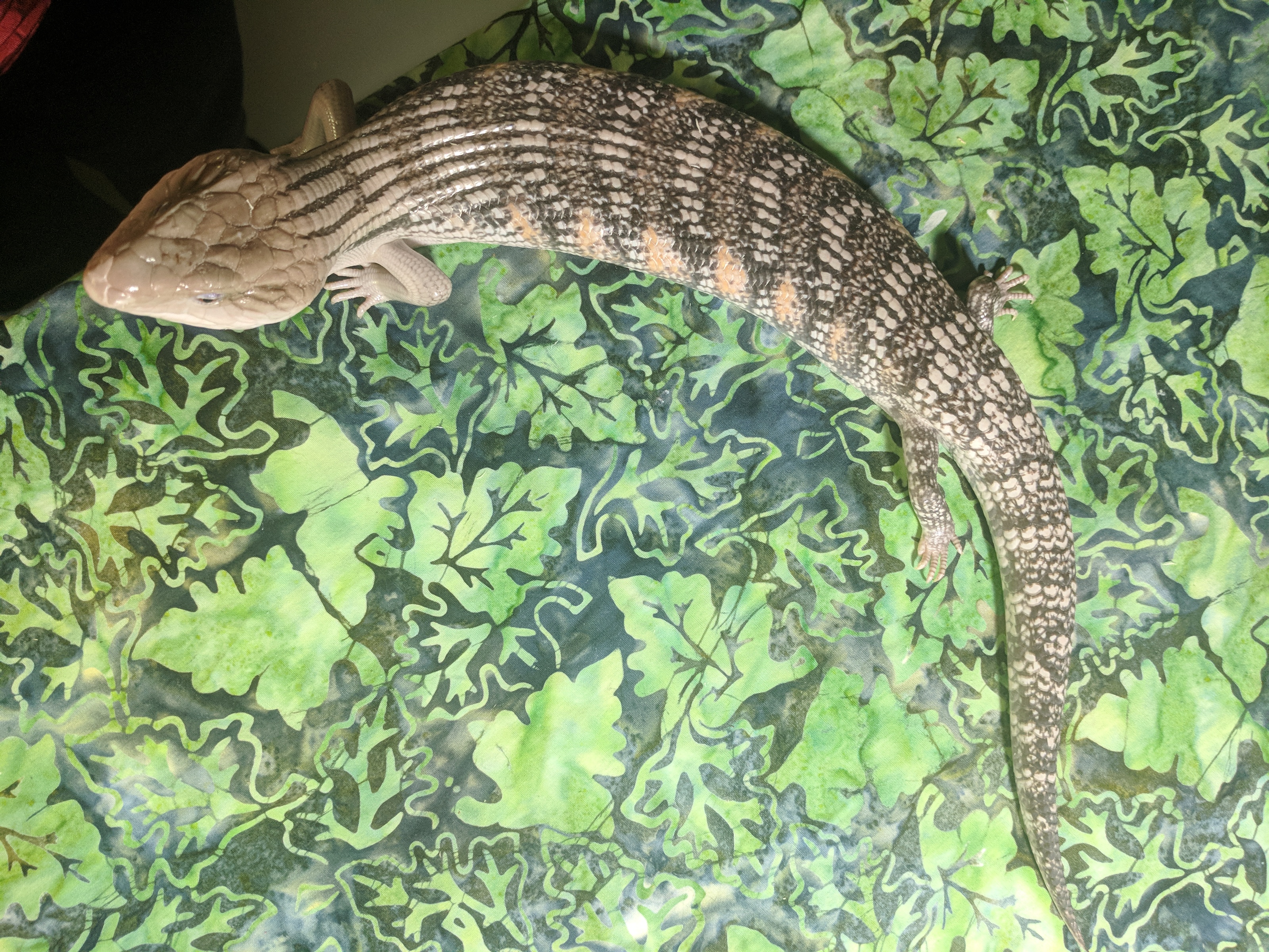 And yet after a winter where she was medically cleared (all her insides seemed normal), she came into breeding season. And her behaviour totally changed – aggressive twit into a sweet, receptive lady. So I decided (with medical professional input) to give her the chance to breed. Originally I hoped to use Taz (trying to line breed to get more with Taz’s glow), but again, Taz is a hateful skink, so Alrick was brought in – his colours are a lovely complement to hers. I’ve been watching her grow fat this spring with my heart in my throat. And because no one else deserves to stress out about whether she could safely deliver – she did it!!! There will be more about the babies in another post, but Tiberius and her babies are healthy and there are no words for how relieved and ecstatic I am.